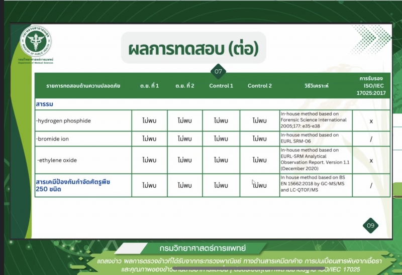 ผลการตรวจสอบด้านคุณภาพทางกายภาพและสิ่งแวดล้อม พบว่า ตัวอย่างข้าวทั้ง 4 ตัวอย่าง มีตัวอย่างที่ไม่พบสิ่งมีชีวิตอยู่ตัวอย่างเดียว คือ ข้าวสารใหม่ที่เป็นตัวอย่างควบคุม ส่วนอีก 1 ตัวอย่างเป็นข้าวเก่าที่ซื้อจากร้านค้าก็มีมอดปนอยู่แต่ไม่มาก แต่ตัวอย่างข้าว 2 ตัวอย่าง ที่กระทรวงพาณิชย์ส่งมา พบว่ามีเศษขาแมลงและมีมอดอยู่ ทั้งนี้ หากพิจารณาตามมาตรฐานสินค้าเกษตร มกษ.4000-2560 ระบุไว้ว่าข้าวหอมมะลิไทยต้องปราศจากแมลงและไรที่มีชีวิต ดังนั้น ถ้าเอามาตรฐานสินค้าเกษตรมาเทียบ ก็จะไม่ผ่าน 3 ตัวอย่าง คือ ข้าวจากกระทรวงพาณิชย์ และข้าวเก่าในร้านค้า