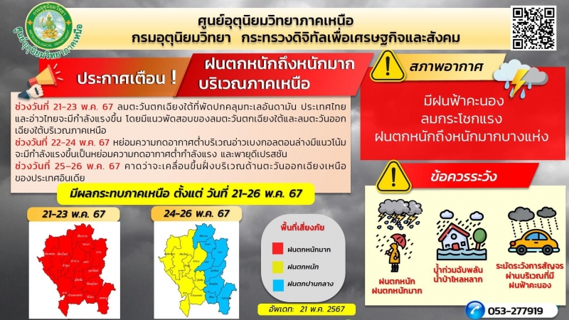 | • เตรียมพร้อม!! กรมอุตุฯเตือน ภาคเหนือ ฝนหนักถึงหนักมาก วันที่21-26 พ.ค.67 |
