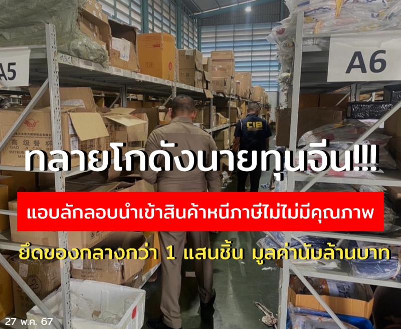 พฤติการณ์ เนื่องจากว่าเจ้าหน้าที่ตำรวจชุดตรวจค้นได้รับเบาะแสร้องเรียนมาจากประชาชนว่าได้สั่งซื้อสินค้าไปแล้วมีสินค้าไม่ตรงปก และได้รับของที่ไม่มีคุณภาพ จึงได้ทำการร้องเรียนผ่านเพจ facebook เจ้าหน้าที่ชุดตรวจค้นจึงได้ทำการสืบสวนจนสืบทราบว่า โกดังสินค้าในพื้นที่ หมู่ที่ 5 ตำบลแพรกษาใหม่ อำเภอเมือง จังหวัดสมุทรปราการ มีการนำเข้าสินค้าที่น่าเชื่อว่าลักลอบนำเข้าจากต่างประเทศ โดยผิดกฎหมายและเป็นสินค้าที่ไม่มีคุณภาพ มาจำหน่ายให้กับประชาชน ทำให้ประชาชนได้รับความเสียหาย และอาจจะก่อให้เกิดอันตรายต่อสุขภาพในอนาคต จึงได้ทำการขอหมายค้นศาลจังหวัดสมุทรปราการ ที่ 565/2567 ลงวันที่ 23 พฤษภาคม 2567 เพื่อเข้าตรวจค้นและตรวจสินค้าโดยละเอียด เมื่อเจ้าพนักงานตำรวจชุดตรวจค้นเข้าตรวจค้น พบนางสาวเอ (นามสุมติ) เป็นผู้นำตรวจค้นและนางสาวเอแจ้งว่า มีนายทุนจีน เป็นเจ้าของสินค้า และกิจการดังกล่าว ผลการตรวจค้นพบสินค้าลักลอบนำเข้าหนีภาษีจากต่างประเทศจริง และเป็นสินค้าที่ไม่มีคุณภาพหลากหลายประเภท จำนวนกว่า ๑๐๐,๐๐๐ ชิ้น มูลค่ากว่าล้านบาท และยังไม่มีผู้ติดต่อมาแสดงเอกสารการนำเข้า และการชำระภาษีศุลกากรแสดงต่อเจ้าหน้าที่ตำรวจได้ เจ้าหน้าที่ตำรวจจึงได้ทำบันทึกตรวจค้นและยึดสินค้าดังกล่าวไว้ เพื่อทำการตรวจสอบและขยายผลดำเนินคดีกับบุคคลที่เกี่ยวข้องต่อไป การกระทำดังกล่าวมีความผิดฐาน “ช่วยซ่อนเร้น ช่วยจำหน่าย ช่วยพาเอาไปเสีย ซื้อ รับจำนำหรือรับไว้ โดยประการใดซึ่งของอันตนพึงรู้ว่าเป็นของอันเข้ามาในหรือส่งออกไปนอกราชอาณาจักรซึ่งของที่ยังมิได้ผ่านพิธีการศุลกากร”อันเป็นความผิดตามาตรา ๒๔๖ พ.ร.บ. ศุลกากรฯ