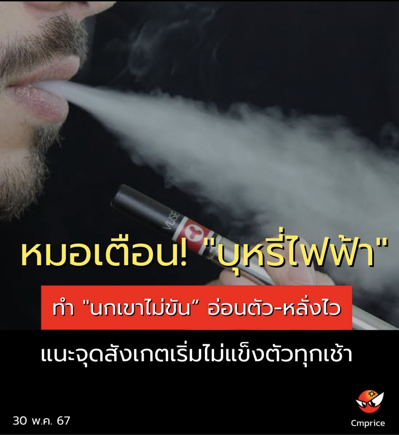 หมอเตือนสูบ “บุหรี่ไฟฟ้า” เพิ่มเสี่ยง “นกเขาไม่ขัน” ทั้งอ่อนตัว หลั่งไว ไปไม่ถึงฝั่งฝัน แนะจุดสังเกตเริ่มไม่แข็งตัวทุกเช้า เผย “นิโคติน” ทำเสพติด ไม่อยากมีเซ็กซ์ ซ้ำกระตุ้นอนุมูลอิสระทำลายผนังด้านในหลอดเลือดองคชาตจนหดตัว หากไม่รักษาสัญญาณเตือนเสี่ยงโรคหัวใจในอีก 5 ปี ถึง 80%