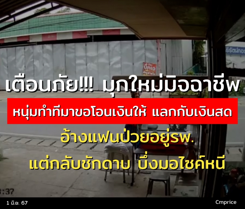 | • มีคลิป*เตือนภัย!! หนุ่มทำทีมาขอโอนเงินให้ แลกกับเงินสดอ้างแฟนป่วยอยู่รพ. แต่กลับชักดาบ บึ่งมอไซค์หนี |