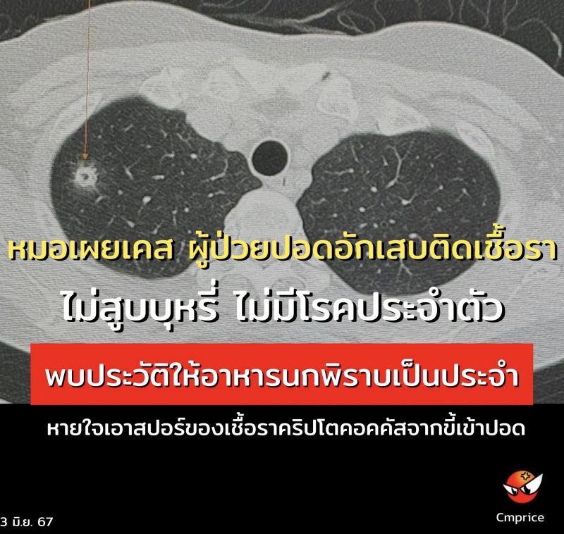 | • หมอเผยเคส ผู้ป่วยปอดอักเสบติดเชื้อรา ไม่สูบบุหรี่ ไม่มีโรคประจำตัว พบประวัติให้อาหารนกพิราบเป็นประจำ |