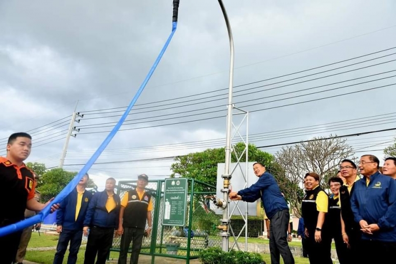 พร้อมกันนี้ นายกรัฐมนตรี ได้มอบแกลลอนบรรจุน้ำดื่ม 5 ลิตรให้ตัวแทนประชาชนแต่ละหมู่บ้าน พร้อมถ่ายภาพร่วมกับประชาชนอย่างเป็นกันเอง จากนั้นนายกฯ ได้เปิดวาล์วน้ำให้กับรถบรรทุกน้ำ เพื่อนำน้ำที่มีคุณภาพและมีมาตรฐานไปแจกจ่ายให้กับประชาชนในพื้นที่ที่ยังเข้าไม่ถึงแหล่งน้ำสะอาด