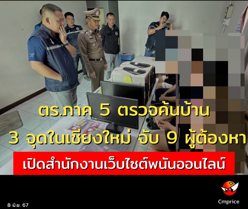 7 มิถุนายน 2567-ตำรวจภูธรภาค 5 โดยการอำนวยการ พล.ต.ท.กฤตธาพล ยี่สาคร ผบช.ภ.5, พล.ต.ต.วีรชน บุญทวี รอง ผบช.ภ.5 , พล.ต.ต.วรพงศ์ คำลือ ผบก.สส.ภ.5 พร้อมด้วยเจ้าหน้าที่ตำรวจ บก.สส.ภ.5 ทำการจับกุมออฟฟิศสำนักงานเว็บไซต์พนันออนไลน์เครือข่าย