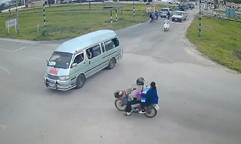 คลิป วินาที ** จยย. ชนกับ รถยนต์ตู้รับ-ส่งนักเรียน สี่แยกขนส่งลำพูน เจ็บ 7ราย