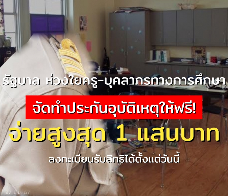 | • รัฐบาล ห่วงใยครู-บุคลากรทางการศึกษา จัดทำประกันอุบัติเหตุให้ฟรี! จ่ายสูงสุด 1 แสนบาท ลงทะเบียนรับสิทธิได้ตั้งแต่วันนี้ |
