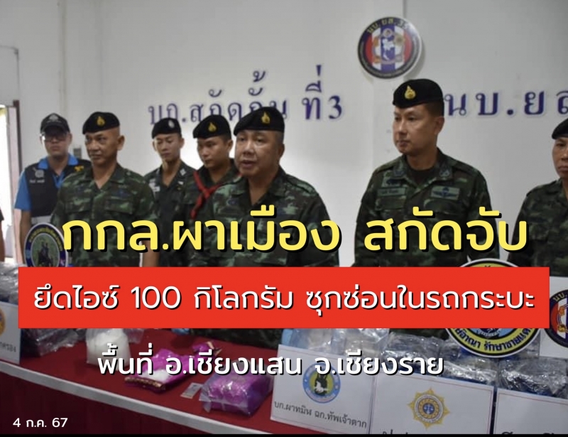 | • กกล.ผาเมือง สกัดจับ ยึดไอซ์ 100 กิโลกรัม ซุกซ่อนในรถกระบะ พื้นที่ อ.เชียงแสน จ.เชียงราย |