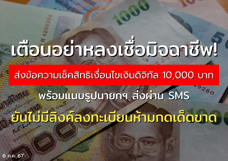 รัฐบาลเตือนอย่าหลงเชื่อมิจฉาชีพ! ส่งข้อความเช็คสิทธิเงื่อนไขเงินดิจิทัล 10,000 บาท พร้อมแนบรูปนายกฯ ส่งผ่าน SMS ยันไม่มีลิงค์ลงทะเบียนห้ามกดเด็ดขาด