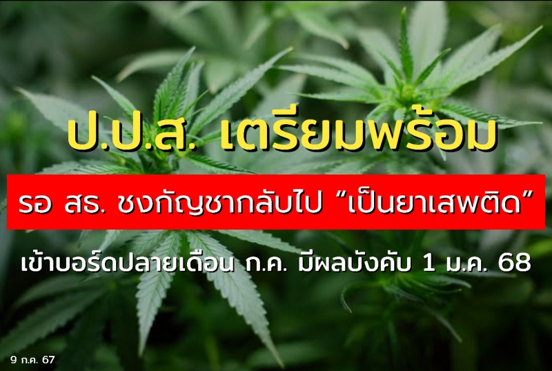 | • ป.ป.ส. เตรียมพร้อมรอ สธ. ชงกัญชากลับไปเป็นยาเสพติด เข้าบอร์ดปลายเดือน ก.ค. มีผลบังคับ 1 ม.ค. 68 |