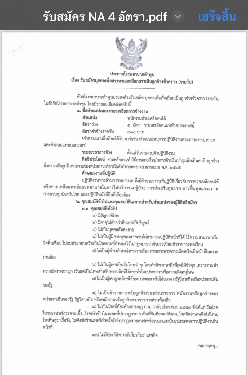 1.โรงพยาบาลลำพูน รับสมัครพนักงานช่วยเหลือคนไข้ 4 อัตรา รับสมัคร 8-19 กค.67