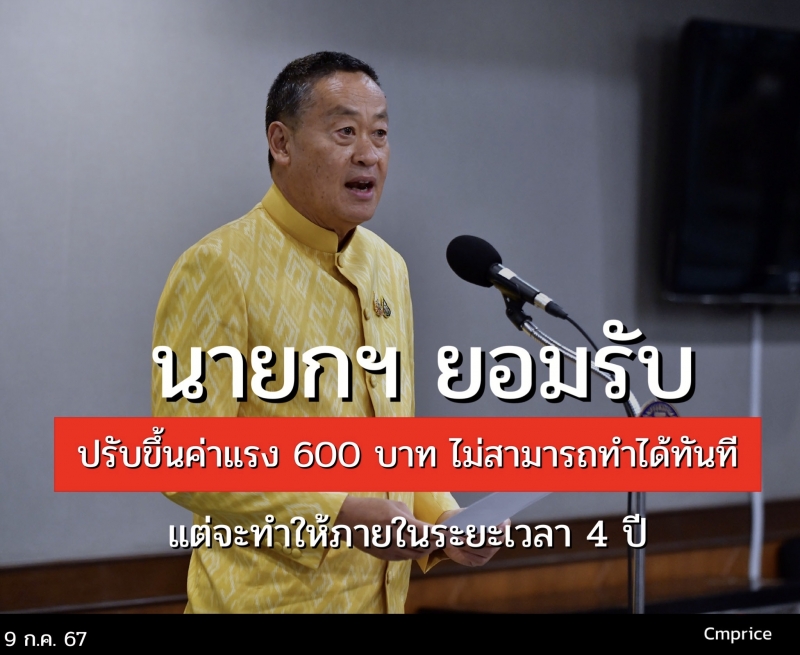| • นายกฯ ยอมรับการปรับขึ้นค่าแรง 600 บาท ไม่สามารถทำได้ทันที แต่จะทำให้ภายในระยะเวลา 4 ปี |