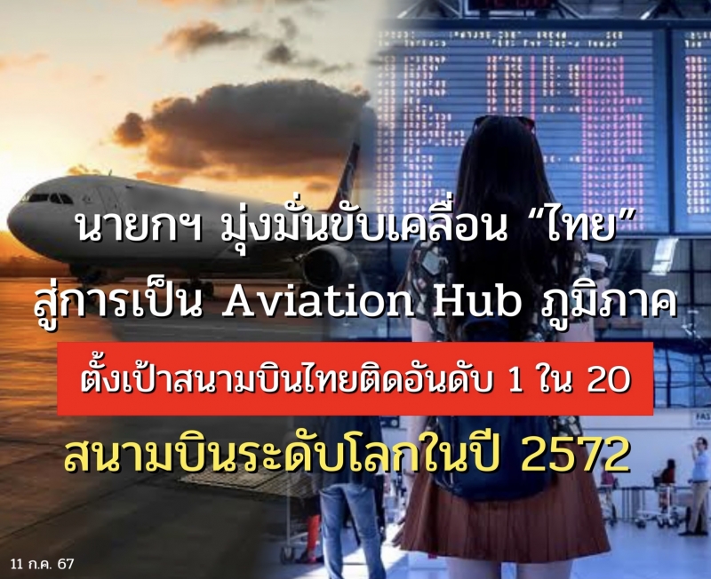 นายกฯ มุ่งมั่นขับเคลื่อนไทยสู่การเป็น Aviation Hub ภูมิภาค ตั้งเป้าสนามบินไทยติดอันดับ 1 ใน 20 ระดับโลกในปี 2572