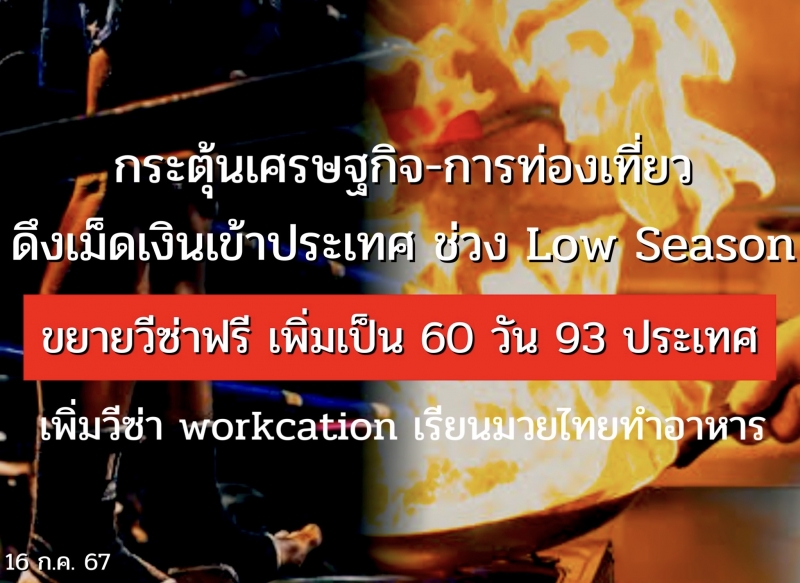 | • นายกรัฐมนตรีเดินเครื่องยนต์ภาคการท่องเที่ยว ขับเคลื่อนเศรษฐกิจไทย ขยายวีซ่าฟรี-เพิ่มวีซ่า (Workcation) |