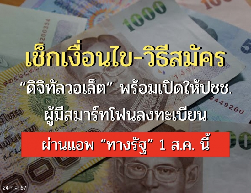 รัฐบาล พร้อมเดินหน้าโครงการเติมเงิน 10,000 บาท ผ่านดิจิทัลวอเล็ต เปิดให้ประชาชนกลุ่มผู้มีสมาร์ทโฟนลงทะเบียน ผ่านแอพ “ทางรัฐ” 1 ส.ค. นี้ และกลุ่มผู้ไม่มีสมาร์ทโฟน ใช้บัตรประชาชนลงทะเบียน 16 ก.ย นี้ ยืนยัน กระบวนการโปร่งใส มีกลไกป้องกันการทุจริต