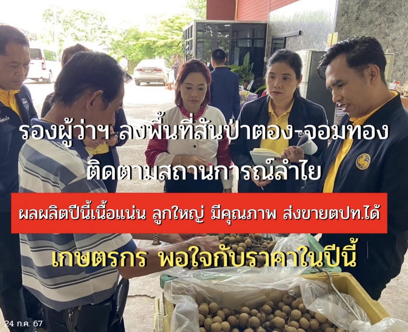 (23 ก.ค. 67) นายนิรัตน์ พงษ์สิทธิถาวร ผู้ว่าราชการจังหวัดเชียงใหม่ มอบหมายให้ นายวีรพงศ์ ฤทธิ์รอด รองผู้ว่าราชการจังหวัดเชียงใหม่ พร้อมด้วยพาณิชย์จังหวัดเชียงใหม่และหน่วยงานที่เกี่ยวข้อง ลงพื้นที่ไปยังอำเภอสันป่าตอง และอำเภอจอมทอง เพื่อติดตามสถานการณ์ลำไย รวมถึงให้กำลังใจผู้ประกอบการและเกษตรกร ก่อนเข้าสู่ช่วงเดือนสิงหาคมซึ่งคาดว่าจะเป็นเดือนที่มีผลผลิตลำไยออกสู่ตลาดมากที่สุด