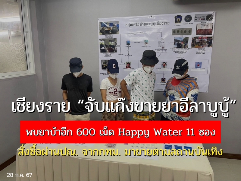 | • เชียงราย จับแก๊งขายยาอีลาบูบู้ พบยาบ้าอีก 600 เม็ด Happy Water 11 ซอง สั่งซื้อผ่านปณ. จากกทม. มาขายตามสถานบันเทิง |