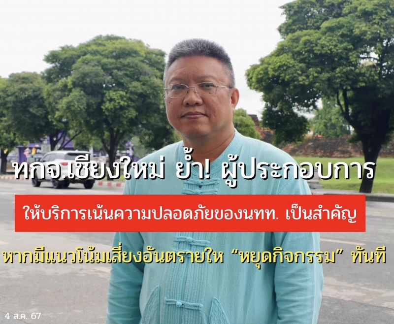 | • ทกจ.เชียงใหม่ ย้ํา! ผู้ประกอบการให้บริการเน้นความปลอดภัยของนทท.เป็นสำคัญในช่วงฤดูฝน หากมีแนวโน้มเสี่ยงอันตรายให้หยุดกิจกรรมทันที |