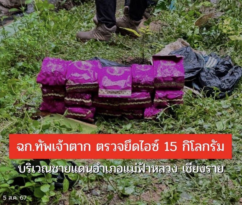 ฉก.ทัพเจ้าตาก ตรวจยึดไอซ์ 15 กิโลกรัม บริเวณชายแดนอำเภอแม่ฟ้าหลวง จังหวัดเชียงราย