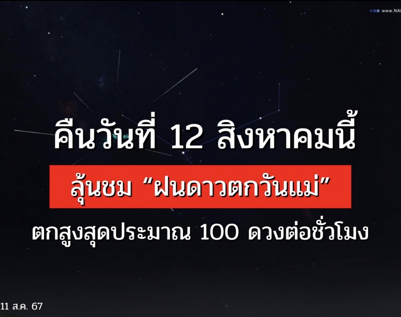 คืนวันแม่ 12 สิงหาคม ถึงรุ่งเช้า 13 สิงหาคม 2567 มีปรากฏการณ์ “ฝนดาวตกเพอร์เซอิดส์” หรือ “ฝนดาวตกวันแม่” อัตราการตกสูงสุดประมาณ 100 ดวงต่อชั่วโมง แนะชมหลังเที่ยงคืนเป็นต้นไป ไร้แสงจันทร์รบกวน หากฟ้าใสไร้ฝน ชมด้วยตาเปล่าได้ทุกภูมิภาคทั่วไทย