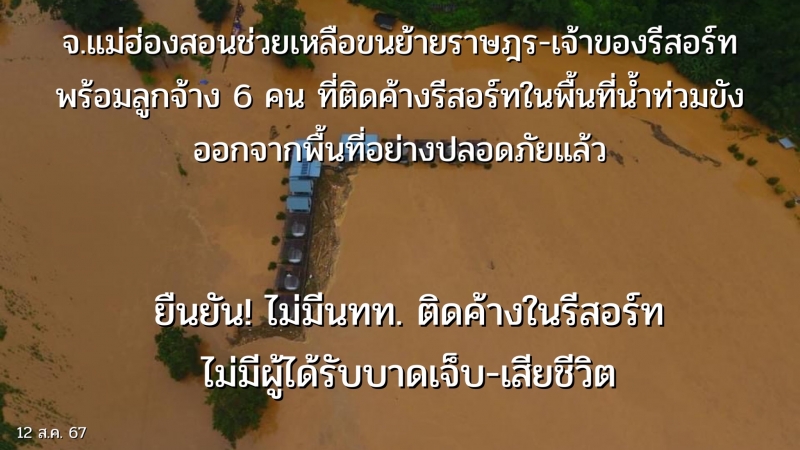 จ.แม่ฮ่องสอนช่วยเหลือขนย้ายราษฎร-เจ้าของรีสอร์ท พร้อมลูกจ้าง 6 คน ที่ติดค้างรีสอร์ทในพื้นที่น้ำท่วมขัง ออกจากพื้นที่อย่างปลอดภัยแล้ว