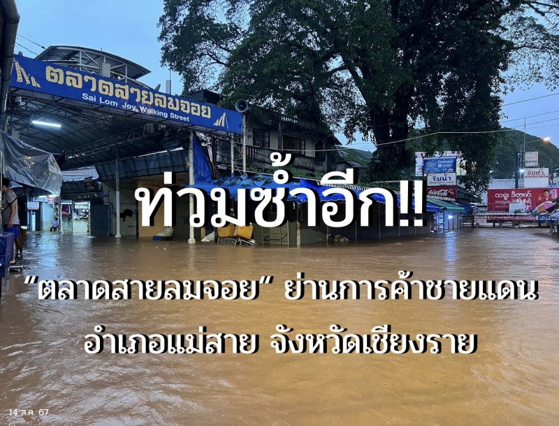 (14 ส.ค. 67) เวลาประมาณ 07.00 น. ที่ตลาดสายลมจอย ย่านการค้าชายแดน อำเภอแม่สาย จังหวัดเชียงราย ซึ่งตั้งอยู่ริมฝั่งแม่น้ำสาย ซึ่งเป็นแม่น้ำพรมแดนไทย-เมียนมา โดยน้ำจากลำน้ำสายเอ่อเข้าท่วมฉับพลัน บริเวณถนนสายกลางตลาดสายลมจอย ระดับน้ำสูงประมาณ 30 เซ็นติเมตร ขณะที่บริเวณริมแม่น้ำซึ่งมีร้านค้า ร้านอาหารตั้งอยู่ ระดับน้ำท่วมสูงกว่า 1-2 เมตร ส่วนระดับน้ำในแม่น้ำน่าจะประมาณ 5.50 เมตร ระดับน้ำสูงจนถึงพื้นสะพานข้ามลำน้ำสายแห่งที่ 1 ซึ่งถือว่าเป็นระดับน้ำที่สูงเกิน อยู่ในระดับวิกฤติ