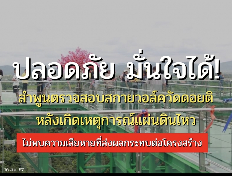 เมื่อวันนี้ (15 สิงหาคม 2567) เวลา 12.15 น. นายสันติธร ยิ้มละมัย ผู้ว่าราชการจังหวัดลำพูนมอบหมายให้นายณรงค์ ทาอุปรงค์ โยธาธิการและผังเมืองจังหวัดลำพูน พร้อมด้วยนายธนา นวลปลอด หัวหน้าป้องกันและบรรเทาสาธารณภัยจังหวัดลำพูน เจ้าอาวาสวัดดอยติ กองช่างเทศบาลตำบลป่าสัก และหน่วยงานที่เกี่ยวข้อง ได้ลงพื้นที่ตรวจสอบสกายวอล์ควัดดอยติ ตั้งอยู่ที่วัดดอยติจังหวัดลำพูน ซึ่งเป็นแหล่งท่องเที่ยวแห่งใหม่และเป็นแลนด์มาร์คจุดชมวิวของจังหวัดลำพูน เพื่อสร้างความเชื่อมั่น และสร้างความมั่นใจกับพี่น้องประชาชนชาวจังหวัดลำพูนและนักท่องเที่ยวที่เดินทางมาใช้บริการสกายวอล์คแห่งนี้ หลังกรมอุตุวิทยาได้มีประกาศแจ้งเตือนเรื่องเกิดแผ่นดินไหวเมื่อวันที่ 15 สิงหาคม เวลา 01.33 น. จุดศูนย์กลางอยู่ตำบลแม่ทา อำเภอแม่ออน จังหวัดเชียงใหม่ ขนาด 3.4 ความลึก 1 กิโลเมตร ซึ่งอยู่ติดกับจังหวัดลำพูน อาจจะส่งผลกระทบ และทำให้ประชาชนเกิดความตระหนก โดยจากการตรวจสอบเบื้องต้นในด้านวิศวกรรมโครงสร้าง รวมไปถึงการตรวจสอบรอยร้าวต่างๆ ไม่พบและไม่มีผลกระทบกับตัวโครงสร้างแต่อย่างใด นอกจากนี้ทางผู้ประกอบการได้ชี้แจงถึงรายละเอียดในการก่อสร้าง ว่าได้ดำเนินการตามมาตรฐานทางวิศวกรรม และถูกต้องตามกฎระเบียบ รวมทั้งได้รับอนุญาตก่อสร้างจากทางเทศบาลตำบลป่าสักมีวิศวกรรับรองแบบเรียบร้อยก่อนเริ่มดำเนินการก่อสร้าง อีกทั้งการดำเนินการก่อสร้างเป็นไปตามมาตรฐานเพื่อรองรับการเกิดแผ่นดินไหว