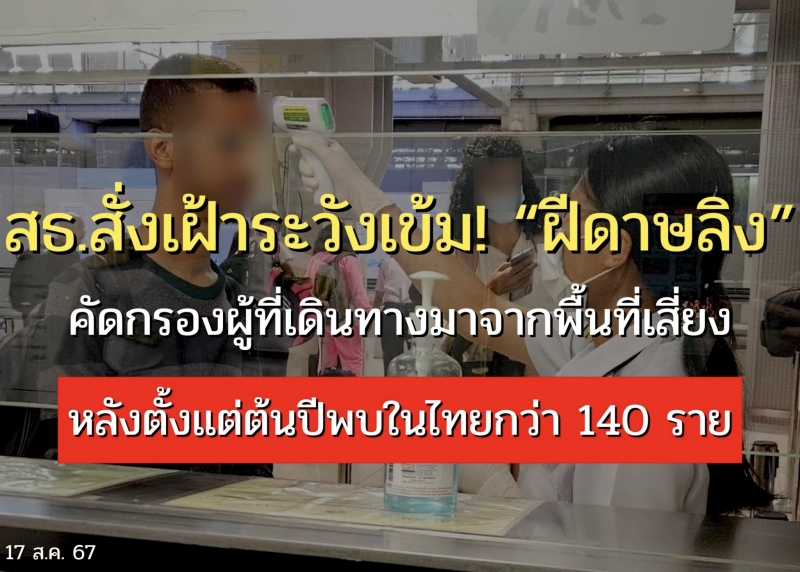 | • สธ.สั่งเฝ้าระวังเข้ม! ฝีดาษลิง คัดกรองผู้ที่เดินทางมาจากพื้นที่เสี่ยง หลังตั้งแต่ต้นปีพบในไทยกว่า 140ราย |