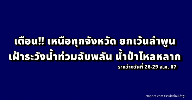 | • เตือน!! เหนือทุกจังหวัด ยกเว้นลำพูน เฝ้าระวังน้ำท่วมฉับพลัน น้ำป่าไหลหลาก 26-29 ส.ค. 67 |