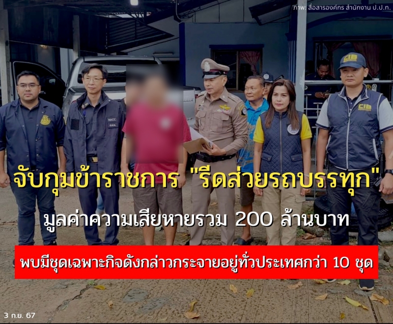 วันนี้ (อังคารที่ 3 กันยายน 2567) - เวลา 06.00 น. สำนักงาน ป.ป.ท. ภายใต้การอำนวยการของนายภูมิวิศาล เกษมศุข เลขาธิการคณะกรรมการ ป.ป.ท. และนายเอกชัย เกษมสุขธวัช รองเลขาธิการคณะกรรมการ ป.ป.ท. มอบหมายให้ พ.ต.ท. สิริพงษ์ ศรีตุลา ผู้อำนวยการกองปราบปรามการทุจริตในภาครัฐ 2 พ.ต.ท. สราวุธ คำเหลือง ผู้อำนวยการกองอำนวยการต่อต้านการทุจริต และเจ้าหน้าที่ ป.ป.ท. ทั้งส่วนกลางและเขตพื้นที่ ร่วมกับนายไพโรจน์ นิยมเดชา ผู้อำนวยการกลุ่มสืบสวนและปฏิบัติการข่าว 2 สำนักงาน ป.ป.ช. พล.ต.ต.จรูญเกียรติ ปานแก้ว รอง ผบช.ก. และ พล.ต.ต.ประสงค์ เฉลิมพันธ์ ผบก.ปปป. นำกำลังเข้าจับกุมข้าราชการและผู้ที่เกี่ยวข้องกับการเรียกรับเงินจากผู้ประกอบการรถบรรทุก รายละ 100,000 บาท เพื่อให้สามารถบรรทุกน้ำหนักเกินได้โดยไม่ถูกจับกุม พร้อมทั้งตรวจค้นด่านชั่งน้ำหนักที่ผู้ต้องหาปฏิบัติหน้าที่ กว่า 10 จุด