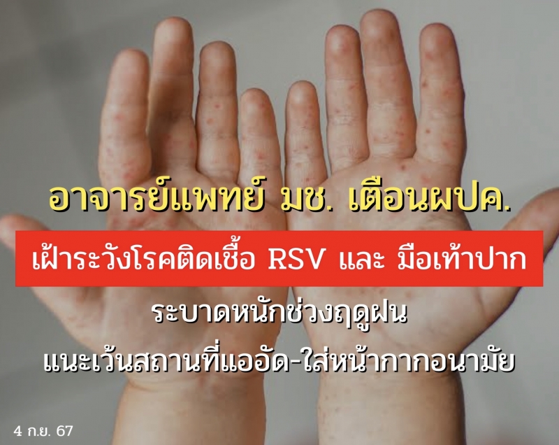 | • อาจารย์แพทย์ มช. เตือนผู้ปกครอง เฝ้าระวังโรคติดเชื้อ RSV และโรคมือเท้าปาก ระบาดหนักช่วงฤดูฝน |