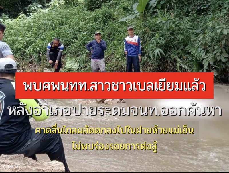 | • เศร้า! พบศพนทท.สาวชาวเบลเยียมแล้ว หลังอำเภอปายระดมออกค้นหา คาดลื่นไถลผลัดตกลงไปในฝายห้วยแม่เย็น |