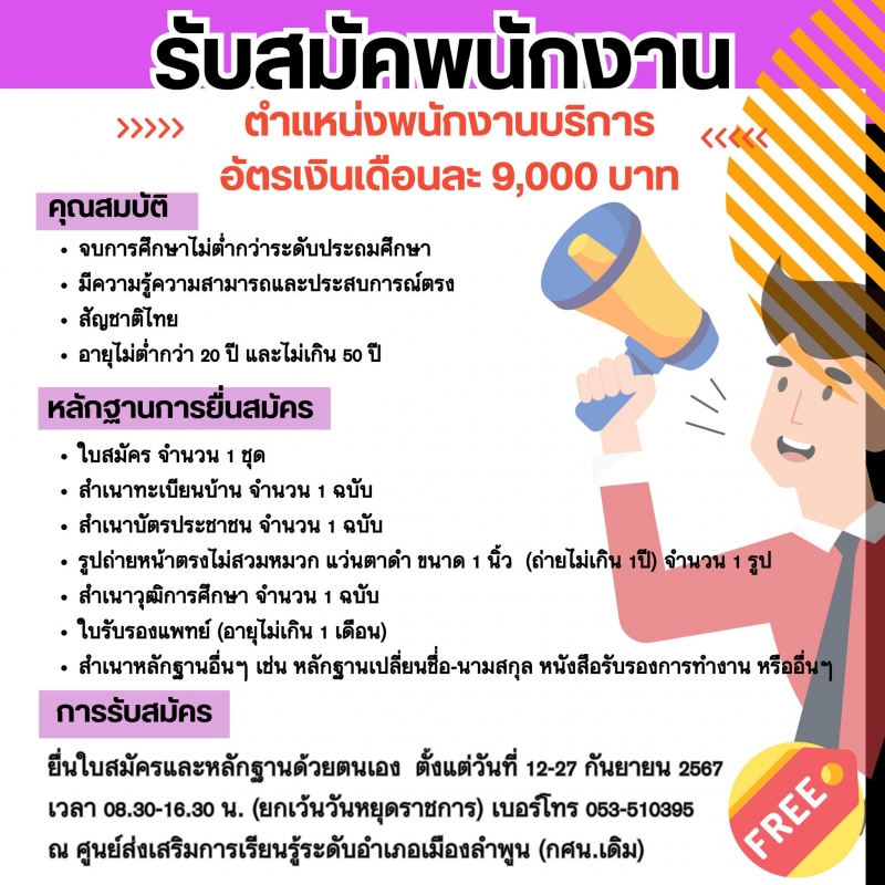 สกร.เมืองลำพูน รับ พนง.บริการ 1 อัตรา เงินเดือน  9,000บาท สมัครถึง 27ก.ย.67