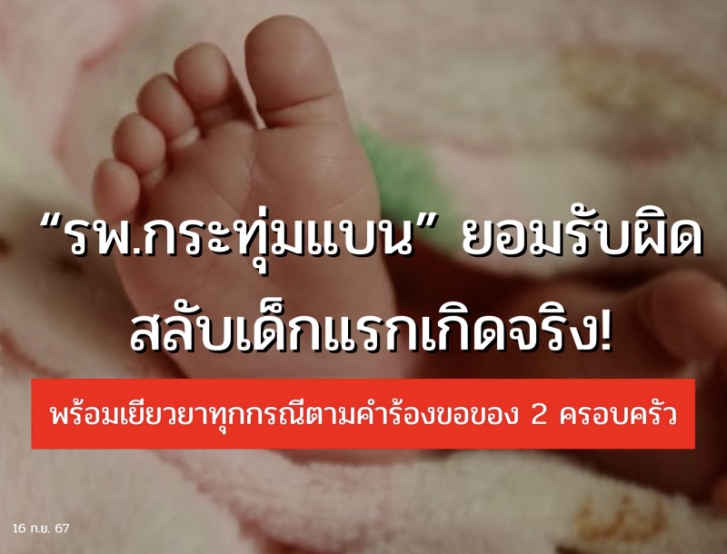 16 กันยายน 67 - จากกรณีคุณพ่อรายหนึ่งโพสต์ลูกน้อยเพิ่งคลอดถูกสลับตัว จึงขอตรวจ DNA พบ “ไม่ใช่ลูกตัวเอง” ถูกสลับกับเด็กพม่า พ่อขอค่าเยียวยาจิตใจ 2 แสนให้ทั้ง2บ้าน