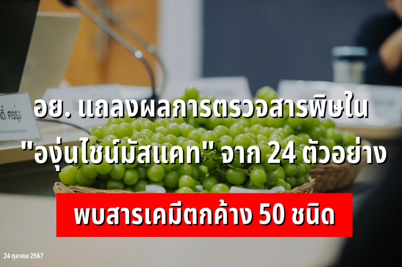วันนี้ ( 24 ตุลาคม 2567 ) ที่มูลนิธิเพื่อผู้บริโภค เครือข่ายเตือนภัยสารเคมีกำจัดศัตรูพืช (Thai-PAN) ร่วมกับนิตยสารฉลาดซื้อ มูลนิธิเพื่อผู้บริโภค และสำนักงานคณะกรรมการอาหารและยา (อย. ) ได้แถลงผลทดสอบสารเคมีเกษตรในองุ่นไชน์มัสแคททั่วกรุงเทพและปริมณฑล