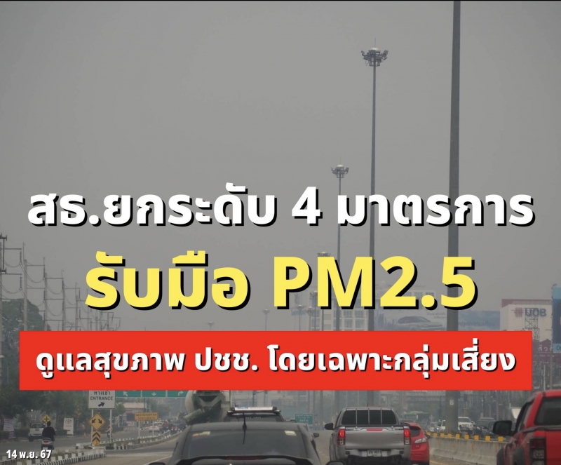 | • กระทรวงสาธารณสุข หารือ 4 มาตรการรับมือสถานการณ์ฝุ่นละอองขนาดเล็ก PM2.5 ดูแลสุขภาพประชาชนให้เข้มข้นมากขึ้น โดยเฉพาะกลุ่มเสี่ยง |