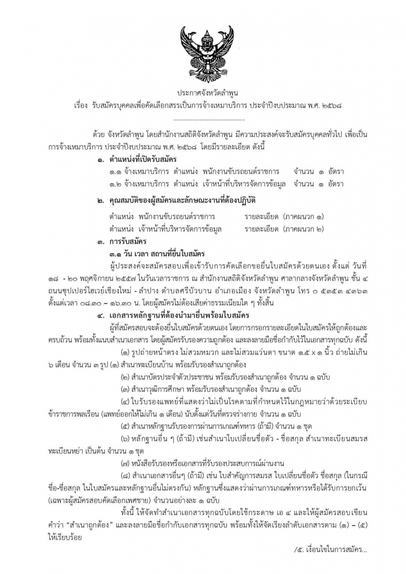 สนง.สถิติลำพูน รับสมัคร พนักงานขับรถ และ จนท.จัดการบริหารข้อมูล