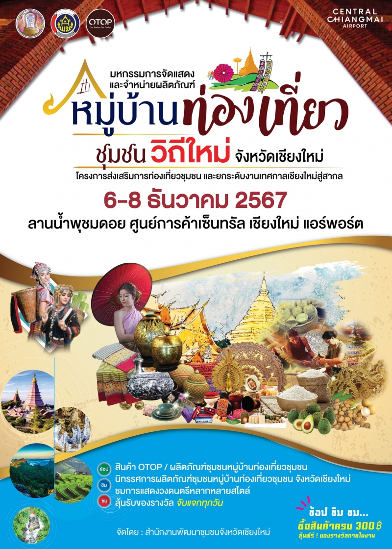ห้ามพลาด!! 6 - 8 ธันวาคม 2567 นี้ ในงาน “มหกรรมการจัดงานแสดงและจำหน่ายผลิตภัณฑ์หมู่บ้านท่องเที่ยวชุมชนวิถีใหม่ จังหวัดเชียงใหม่” บริเวณลานน้ำพุชมดอย ศูนย์การค้าเซ็นทรัล เชียงใหม่ แอร์พอร์ต อ.เมือง จ.เชียงใหม่