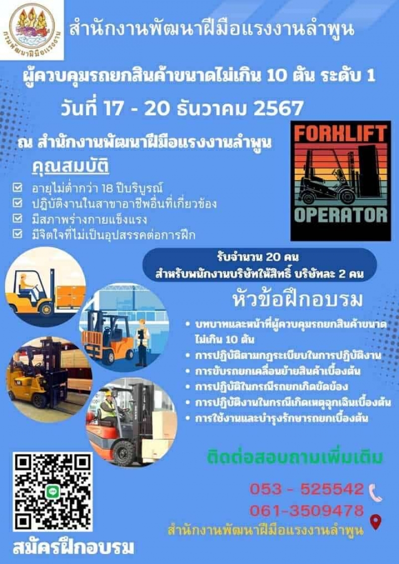 สำนักงานพัฒนาฝีมือแรงงานลำพูน รับสมัครผู้เข้าฝึกอบรม ผู้ควบคุมรถยกสินค้า(FORKLIFT)ขนาดไม่เกิน 10 ต้น ระดับ 1