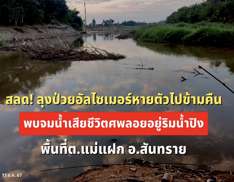 | • สลด! ลุงป่วยอัลไซเมอร์หายตัวไปข้ามคืน พบจมน้ำเสียชีวิตศพลอยอยู่บริเวณริมน้ำปิง พื้นที่ต.แม่แฝก อ.สันทราย |