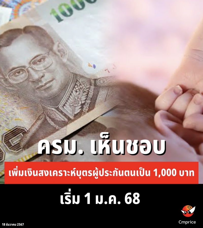 | • ครม. เห็นชอบเพิ่มเงินสงเคราะห์บุตรผู้ประกันตนเป็น 1,000 บาท เริ่ม 1 ม.ค. 68 |