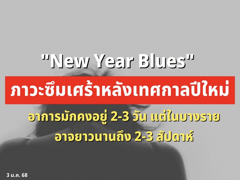 กรมสุขภาพจิต กระทรวงสาธารณสุข เปิดเผยถึงปรากฏการณ์ 'นิวเยียร์บลูส์' (New Year Blues) หรือภาวะซึมเศร้าหลังเทศกาลปีใหม่ ที่อาจส่งผลกระทบต่อสุขภาพจิตของประชาชน และเสนอแนวทางการดูแลตนเองอย่างเป็นระบบ ผ่านช่องทางให้คำปรึกษาพร้อมแนะนำ www.วัดใจ.com เพื่อประเมินสุขภาพใจด้วยตนเอง