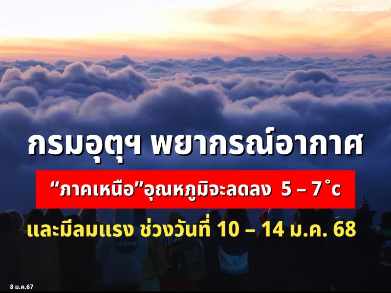 | • กรมอุตุฯ พยากรณ์อากาศ ช่วงวันที่ 10 14 ม.ค. 68 อุณหภูมิลดลง อุณหภูมิจะลดลง 5 7 องศา กับมีลมแรง |