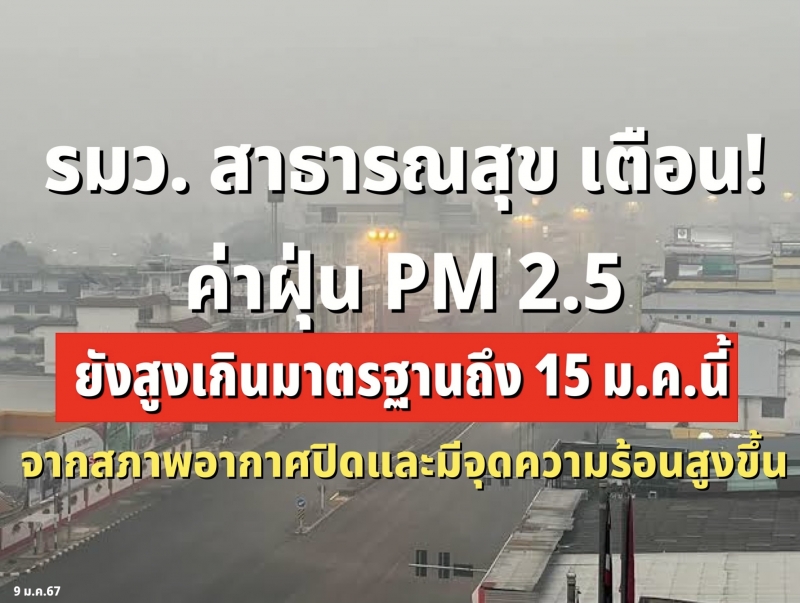 วันนี้ (9 มกราคม 2568) ที่กระทรวงสาธารณสุข จ.นนทบุรี นายสมศักดิ์ เทพสุทิน รัฐมนตรีว่าการกระทรวงสาธารณสุข เป็นประธานการประชุมทางไกลติดตามสถานการณ์และเตรียมความพร้อมด้านการแพทย์และสาธารณสุข กรณีหมอกควันและฝุ่นละอองขนาดเล็ก ปี 2568 โดยมี นพ.โอภาส การย์กวินพงศ์ ปลัดกระทรวงสาธารณสุข พญ.อัมพร เบญจพลพิทักษ์ อธิบดีกรมอนามัย และสำนักงานสาธารณสุขจังหวัดทุกแห่งเข้าร่วม โดยกล่าวว่า สถานการณ์ฝุ่น PM 2.5 ตั้งแต่วันที่ 11 ตุลาคม 2567 - 9 มกราคม 2568 ในภาพรวมพบจังหวัดที่มีค่าฝุ่นเกินมาตรฐาน 37.5 มคก./ลบ.ม. หรือระดับสีส้ม จำนวน 53 จังหวัด โดยวันนี้ พบเกินมาตรฐานระดับมีผลกระทบต่อสุขภาพหรือสีแดง (75 มคก./ลบ.ม.ขึ้นไป) จำนวน 11 จังหวัด ได้แก่ กรุงเทพฯ เพชรบุรี สมุทรสาคร สระบุรี นครปฐม พิษณุโลก นนทบุรี สมุทรปราการ ระยอง สมุทรสงคราม และราชบุรี ทั้งนี้ ค่าฝุ่น มีแนวโน้มจะเกินมาตรฐานไปจนถึงวันที่ 15 มกราคม 2568 เนื่องจากการระบายอากาศต่ำ ทำให้มีสภาพอากาศปิด รวมทั้งพบจุดความร้อนทั้งในประเทศและต่างประเทศสูงขึ้น ฝุ่นละอองจึงมีแนวโน้มสะสมมากขึ้น โดยเฉพาะในพื้นที่ กทม. ปริมณฑล ภาคกลาง และภาคเหนือ
