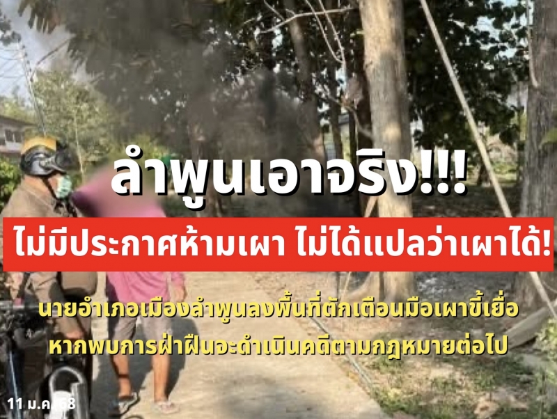นายอำเภอเมืองลำพูน ได้สร้างความเข้าใจข้อกำหนดในการเผาเขตพื้นที่ชุมชนว่า การกระทำดังกล่าวเป็นเหตุให้เกิดกลิ่น แสง รังสี เสียง ความร้อน สิ่งมีพิษ ความสั่นสะเทือน ฝุ่น ละออง เขม่า เถ้า หรือกรณีอื่นใดจนเป็นเหตุให้เสื่อมหรืออาจเป็นอันตรายต่อสุขภาพ ซึ่งเป็นความผิดตาม พ.ร.บ. การสาธารณสุข พ.ศ. 2535 แก้ไขเพิ่มเติม (ฉบับที่3) พ.ศ. 2560 มาตรา 25(4) , 27 วรรคสอง และได้ทำหนังสือว่ากล่าวตักเตือน ห้ามมิให้ดำเนินการเผาอีก หากพบการฝ่าฝืนจะดำเนินคดีตามกฎหมายต่อไป