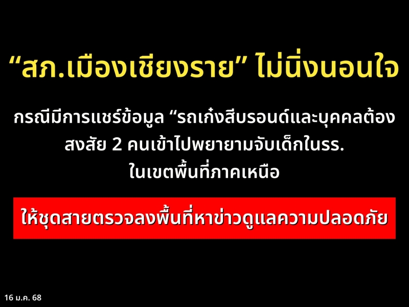 | • สภ.เมืองเชียงราย ไม่นิ่งนอนใจ กรณีมีการแชร์ข้อมูลว่า มีรถเก๋งสีบรอนด์และบุคคลต้องสงสัย 2 คนเข้าไปพยายามจับเด็กในรร.ในเขตพื้นที่ภาคเหนือ ให้ชุดสายตรวจ-สืบสวนลงพื้นที่หาข่าวดูแลความปลอดภัย |