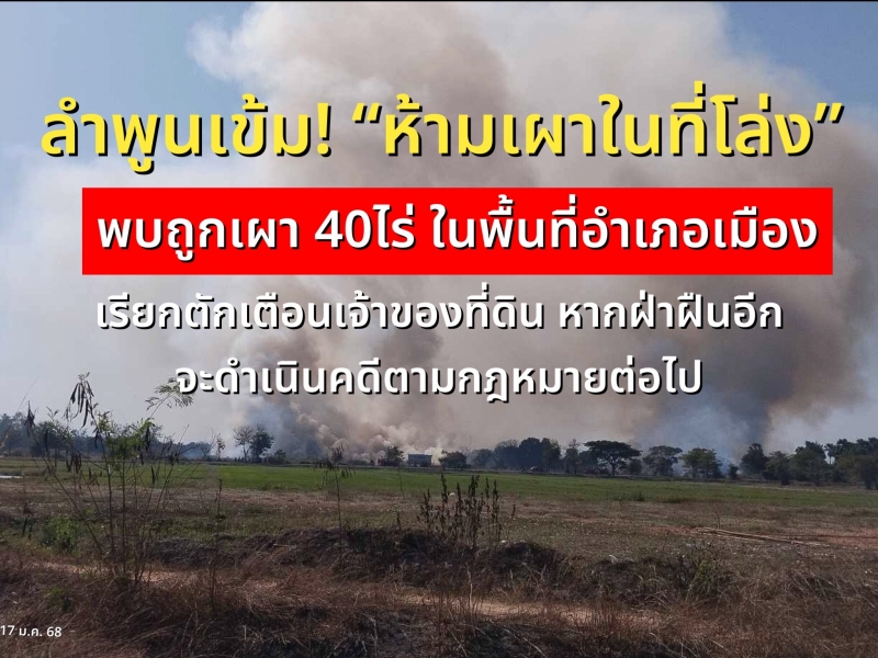| • ลำพูนเข้ม! ห้ามเผาในที่โล่ง พบถูกเผา 40ไร่ ในพื้นที่อำเภอเมืองเรียกตักเตือนเจ้าของที่ดิน หากฝ่าฝืนอีกจะดำเนินคดีตามกฎหมาย |