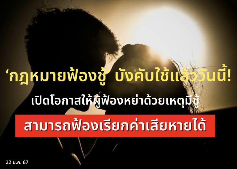 | • กฎหมายฟ้องชู้ บังคับใช้แล้ววันนี้ เปิดโอกาสให้ผู้ฟ้องหย่าด้วยเหตุมีชู้ สามารถฟ้องเรียกค่าเสียหายได้ |