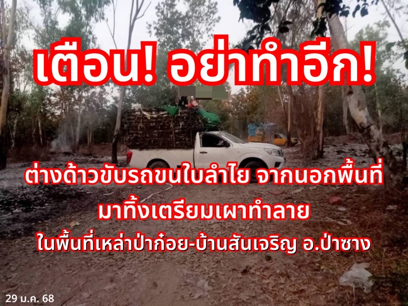 เมื่อวันที่ 28 มกราคม 2568 - เวลาประมาณ 18:30 น. นายภัทรพล ผัดดวงธรรม นายอำเภอป่าซาง มอบหมายให้ นายรังสรรค์ บุญยะสิงห์ กำนัน ต.น้ำดิบ พร้อมด้วย ผู้ใหญ่บ้าน ม.14 ผู้ช่วยผู้ใหญ่ ม.1 และ ม.14 ชรบ. เฝ้าระวังและตรวจสอบการร้องเรียนการนำวัสดุเหลือใช้ทางการเกษตร (เศษใบลำไย) จากโกดังนอกเขตพื้นที่เข้ามาทิ้งในเขตพื้นที่เหล่าป่าก๋อย และบ้านสันเจริญ เพื่อเผาทำลาย
