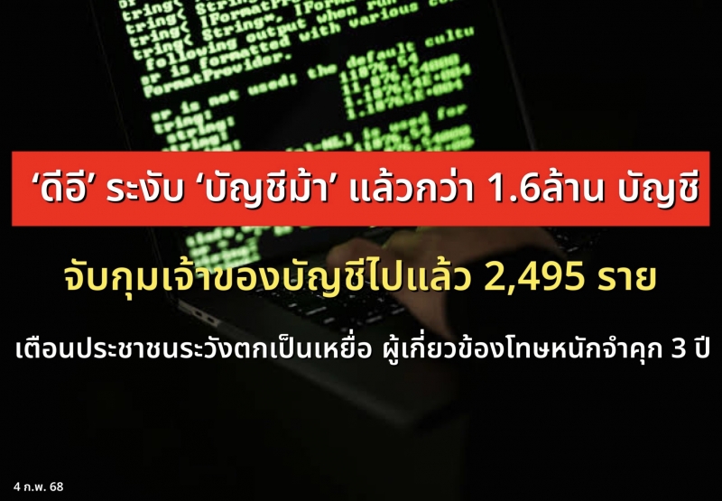 ดีอี ระงับ บัญชีม้า แล้วกว่า 1,600,000 บัญชี จับกุมเจ้าของบัญชีไปแล้ว 2,495 ราย
