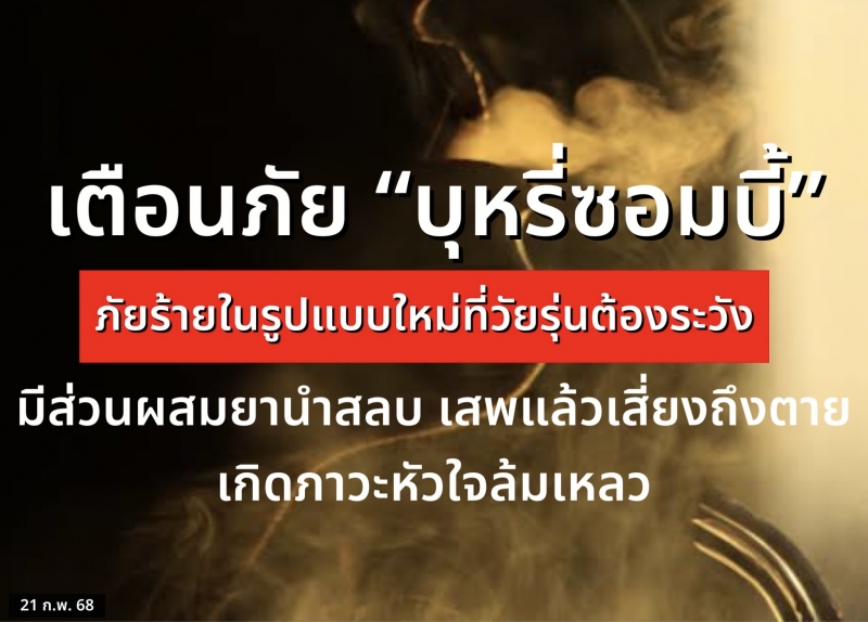 | • กรมการแพทย์ เตือนภัย บุหรี่ซอมบี้ มีส่วนผสมยานำสลบ เสพแล้วเสี่ยงถึงตาย |